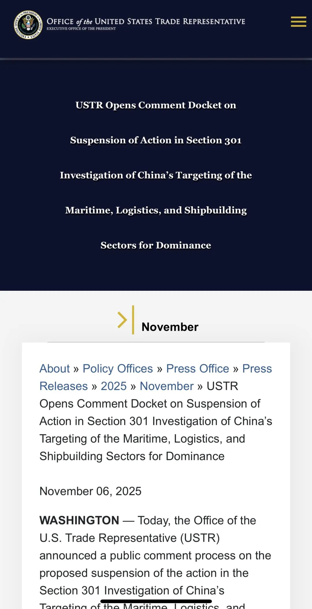 美国贸易代表办公室(USTR)于2025年11月6日发文对暂停海事301行动1年征询意见。截止时间为2025年11月7日下午5:00。