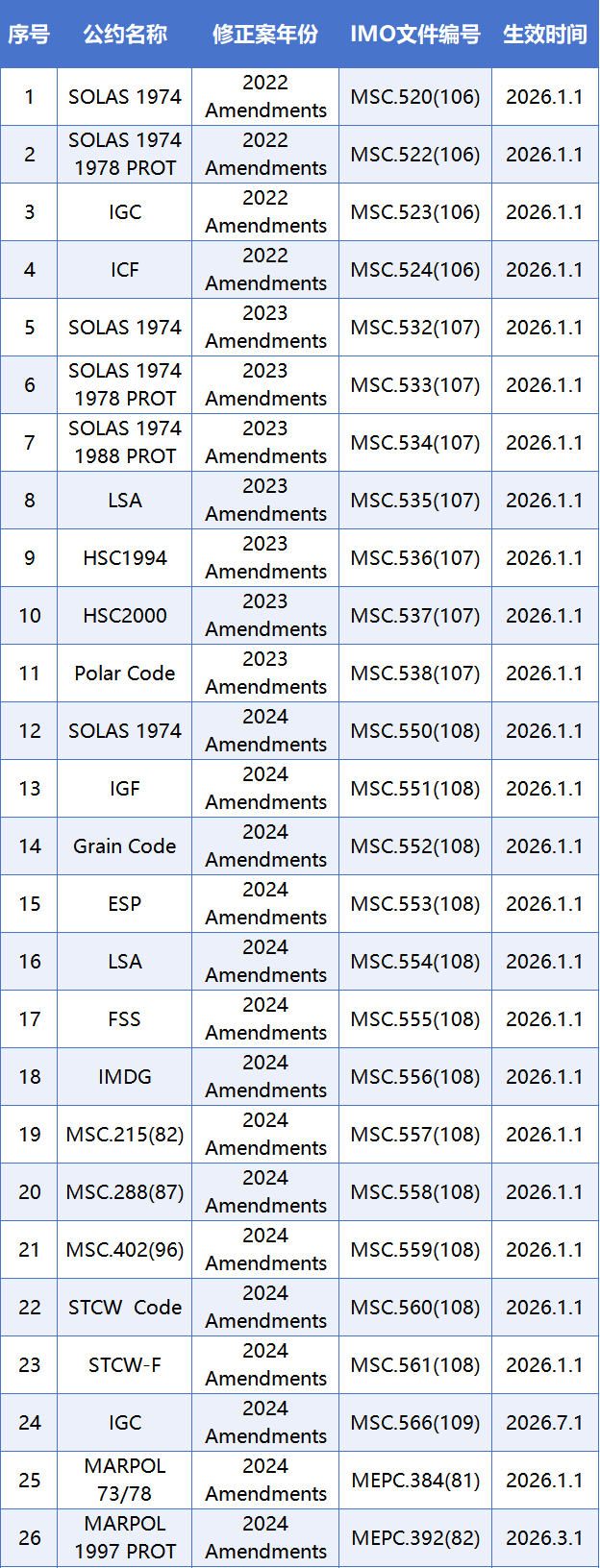 资料库:2026年国际海事公约修正案生效目录一览(中英文下载)
